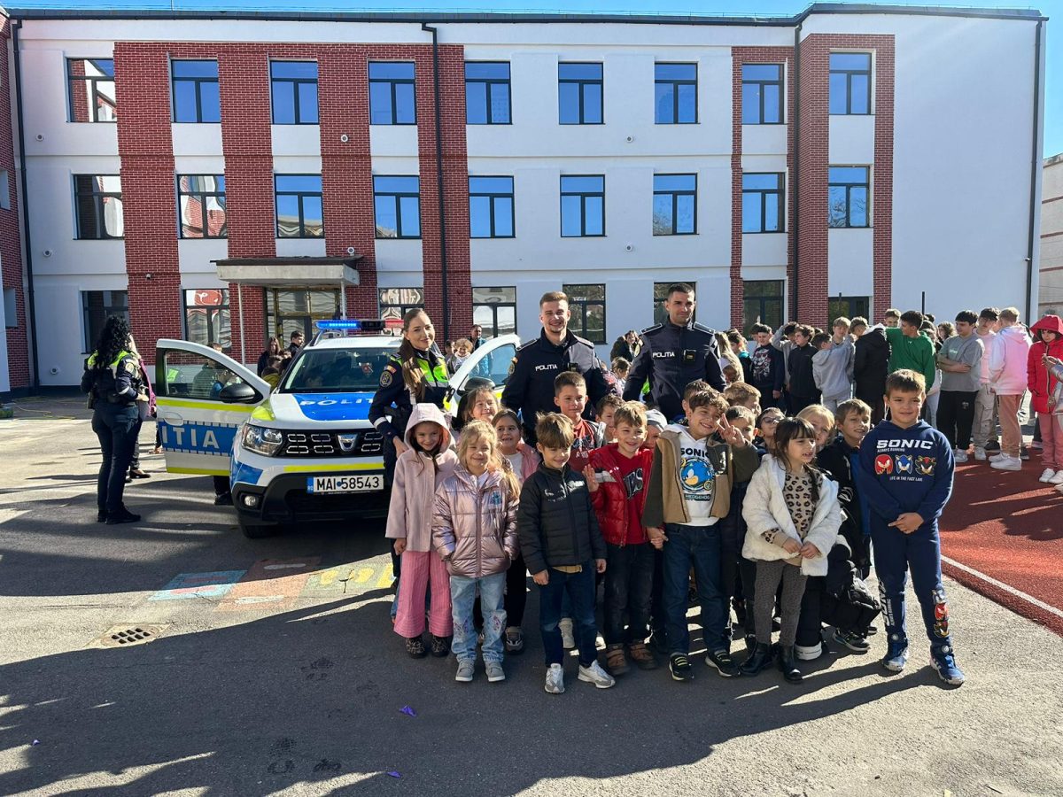 Momentul cel mai așteptat a fost cel în care elevii au putut vedea îndeaproape autospecialele de intervenție ale poliției, un prilej de entuziasm și curiozitate pentru cei mici.