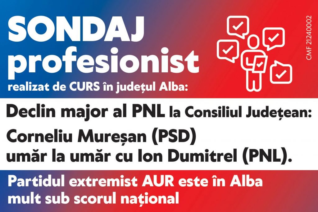 Un sondaj realizat recent de CURS – Centrul de Sociologie Urbană și Regională, unul din cele mai prestigioase institute din România, arată un adevărat declin major al PNL în județul Alba și anunță o posibilă surpriză la Consiliul Județean, unde Corneliu Mureșan (PSD) este umăr la umăr cu Ion Dumitrel (PNL), cel care conduce județul de peste 20 de ani.