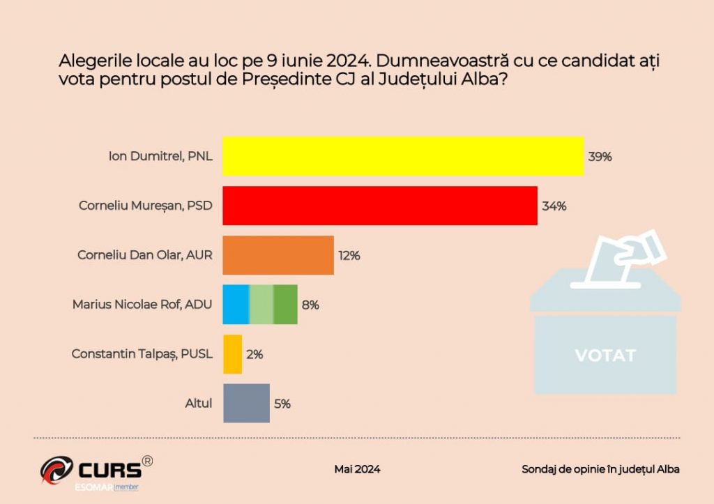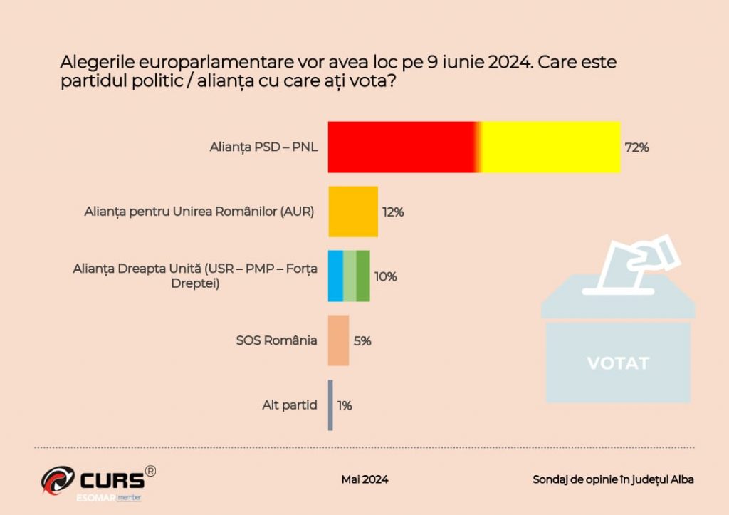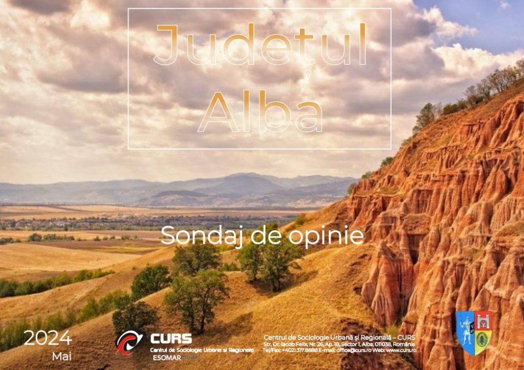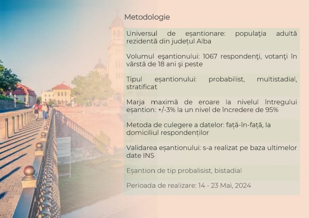 Cercetarea sociologică a fost realizată de CURS – Centrul de Sociologie Urbană și Regională, în perioada 14 – 23 mai 2024, pe un eșantion de 1067 respondenți, respectiv cetățeni cu vârsta de peste 18 ani și cu drept de vot din județul Alba. Marja maximă de eroare la nivelul întregului eșantion: +/-3% . Metoda de culegere a datelor a fost față-în-față cu fiecare respondent, iar validarea eșantionului s-a realizat pe baza ultimelor date ale Institutului Național de Statistică. Centrul de Sociologie Urbană și Regională – CURS este unul dintre cele mai importante institute de sondare a opiniei publice din România, având una dintre cele mai profesioniste echipe de cercetare sociologică și de interpretare a datelor.
