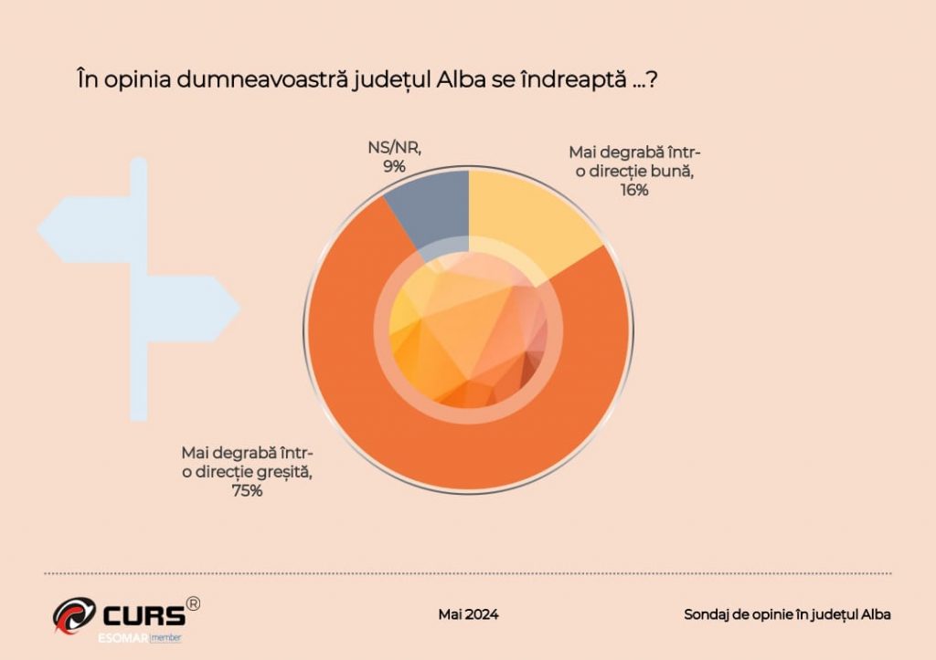 Studiul sociologic arată și că 75% dintre cetățeni cred că județul Alba merge într-o direcție greșită.Cercetarea a fost realizată prin chestionare care au fost aplicate față în față cu cetățenii incluși în sondajul sociologic.