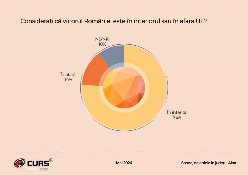 De asemenea, 80% dintre cei chestionați au o părere bună și foarte bună despre Uniunea Europeană și doar 11% au o părere proastă, respectiv 2% foarte proastă. La întrebarea „Considerați că viitorul României este în interiorul sau în afara UE?”, 76 dintre respondenți au răspuns afirmativ și doar 14% au spus că ar dori ca țara să fie în afara Uniunii Europene.