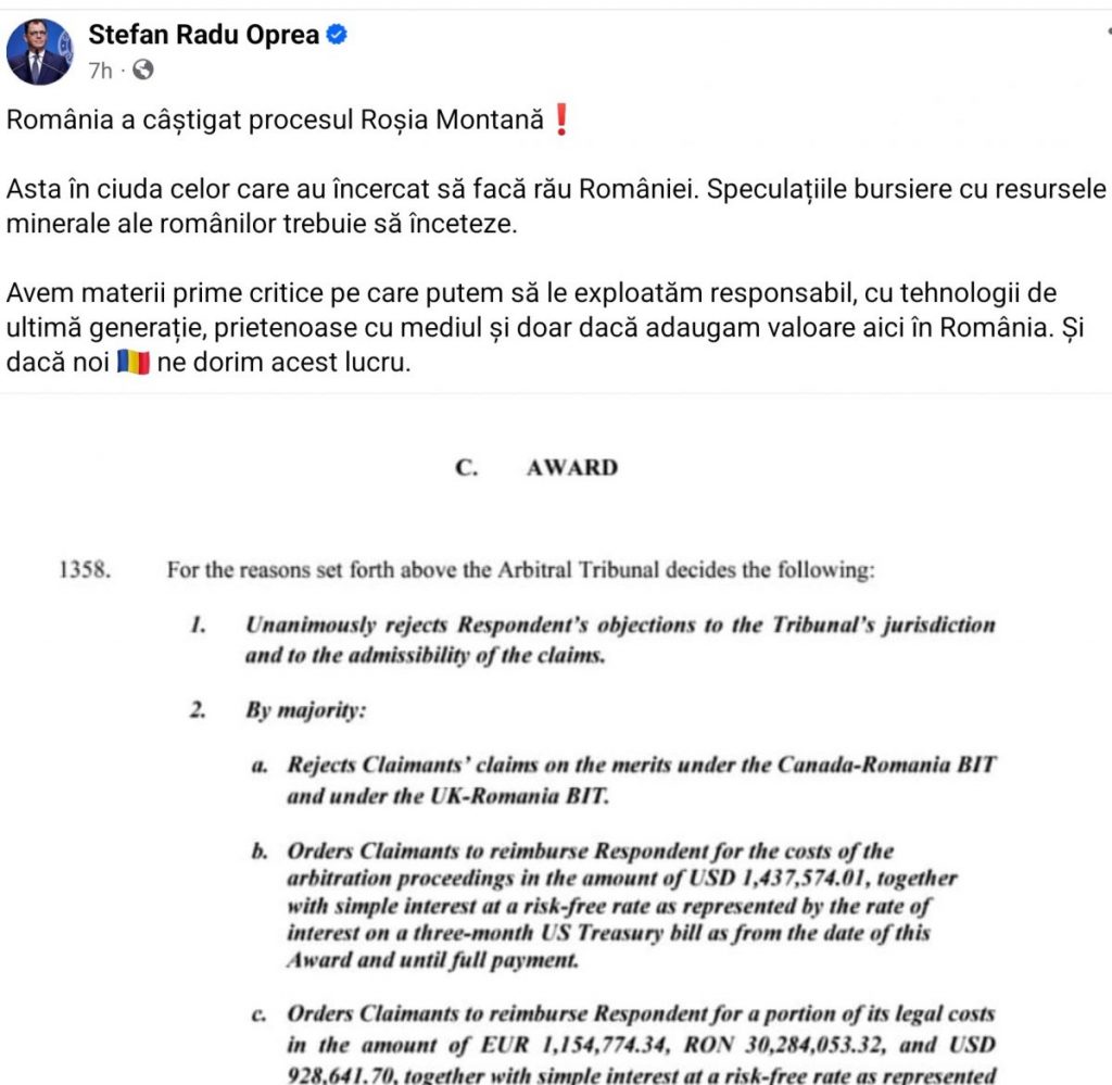 „România a câştigat procesul Roşia Montană. Asta în ciuda celor care au încercat să facă rău României. Speculaţiile bursiere cu resursele minerale ale românilor trebuie să înceteze. Avem materii prime critice pe care putem să le exploatăm responsabil, cu tehnologii de ultimă generaţie, prietenoase cu mediul şi doar dacă adăugăm valoare aici în România. Şi dacă noi ne dorim acest lucru”, a scris ministrul pe pagina sa de Facebook, după aflarea verdictului.