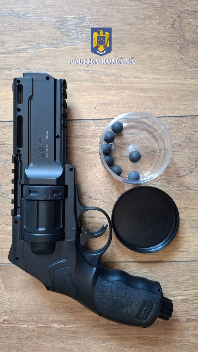 În urma verificărilor efectuate la domiciliul acestuia, polițiștii au descoperit o armă scurtă, neletală, cu bile de cauciuc, de tip revolver, o butelie cu aer comprimat și 7 proiectile din cauciuc de același calibru – muniție aferentă armei respective. Tânărul nu deținea permis legal pentru a avea în posesie astfel de arme sau muniție.