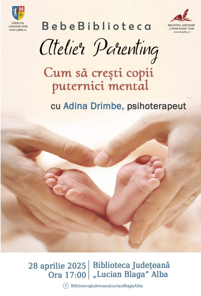 Pornind de la titlul unei cunoscute cărți de parenting scrisă de și mai cunoscuții dr. Charles Fay și dr. Daniel G. Amen, psihoterapeuta Adina Drîmbe, colaboratoare în proiectul 3.1 BebeBiblioteca, și-a propus să abordeze ca temă tocmai acest subiect de mare actualitate: Cum să crești copii puternici mental. Activitatea se va desfășura la sala de lectură a Bibliotecii Județene „Lucian Blaga” Alba, în data de 28 aprilie 2025, de la ora 17:00. La activitatea coordonată din partea bibliotecii județene de bibliografa Ana – Maria Pienar, sunt încurajați să participe părinții împreună cu copiii.
