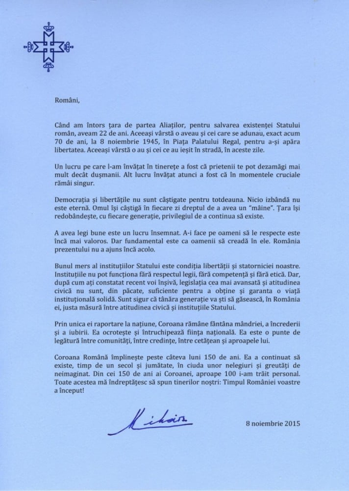 regele mihai fotoÎn contextul actual în care mii de români ies în stradă pentru schimbarea sistemului, singurul mesaj de încurajare vine din partea Regelui Mihai. Majestatea Sa  le-a transmis tinerilor sătui de actualii politicieni un mesaj prin care le spune să nu cedeze și le transmite că Monarhia, Coroana României ”rămâne fântâna mândriei, a încrederii și a iubirii”. Aici mesajul : regele Mihai