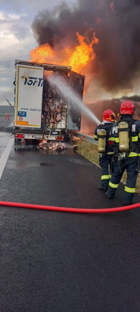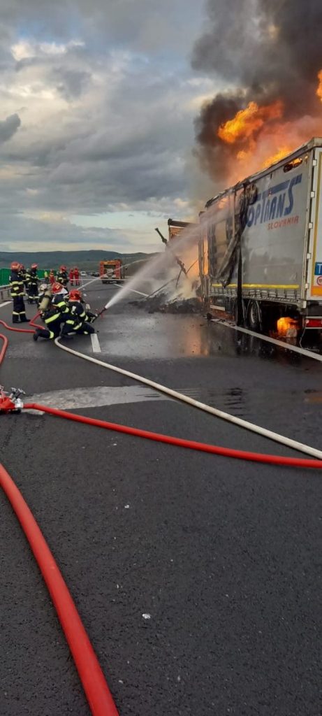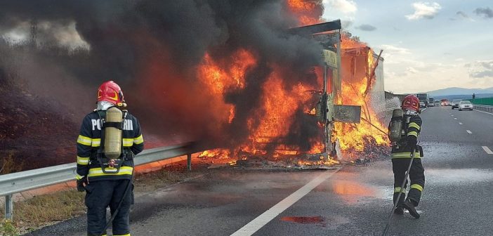 Un TIR care transporta materiale textile a fost distrus, sâmbătă seara, în totalitate în urma unui incendiu pe Autostrada A10, în zona localității Sâncrai.