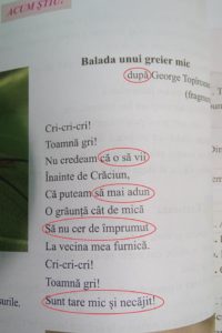 O analiză pertinentă a unei învățătoare din Petroșani scoate la iveală noi aberații apărute în manualele școlare. De data aceasta, femeia, cadru didactic la Colegiul Tehnic ” Dimitrie Leonida” din Petroșani vorbește de o modificare făcută în manualul de clasa a doua legată de poezia ” Balada unui greier mic” de George Topârceanu. În manualul actualizat poezia apare nu ”de” și ”după” Topârceanu.
