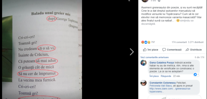 ” Asemeni greierașului din poezie, și eu sunt necăjită! Cine le-a dat dreptul autoarelor manualului să modifice versurile lui Topârceanu? Cum să le cer elevilor mei să memoreze varianta masacrată? Mai ales finalul sună ca naiba!…” a scris pe facebook învățătoarea Petronela Vali Slavu