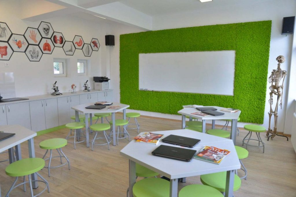 – dotarea cu mobilier, materiale didactice și echipament digital a laboratoarelor de științe (fizică, chimie, biologie) – 6 laboratoare de științe;