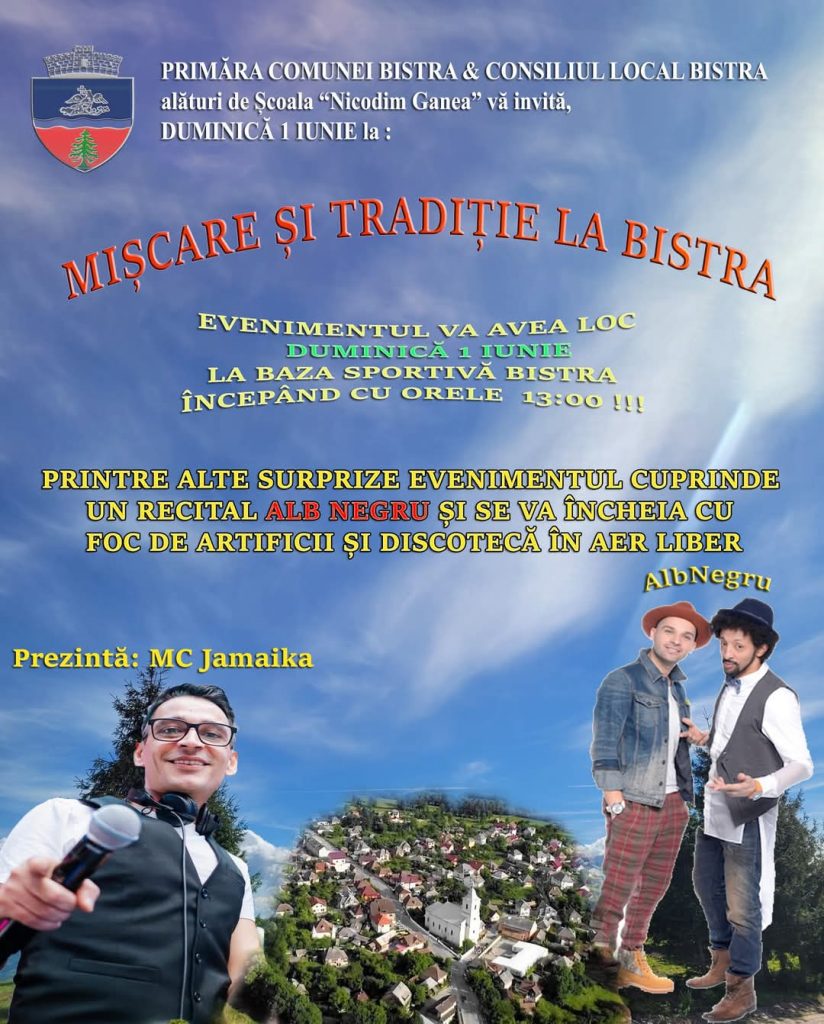 Primăria Comunei Bistra și Consiliul Local, alături de Școala „Nicodim Ganea”, pregătesc o zi plină de distracție și tradiție pentru copiii și întreaga comunitate, cu ocazia Zilei Internaționale a Copilului. Evenimentul intitulat „Mișcare și Tradiție la Bistra” va avea loc duminică, 1 iunie, începând cu ora 13:00, la Baza Sportivă Bistra.